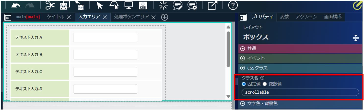 ・パレットから選択した部品のプロパティ設定より、上記1で書き込んだCSSクラスを設定する。