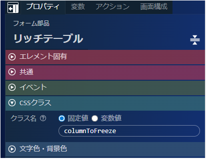 上記の設定で、リッチテーブル上で指定列の固定ができるようになります。