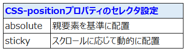 ・CSSのpositionプロパティでは以下の内容に合わせて、設定が必要になります。