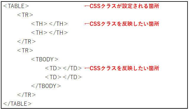 なので、テーブルのセル(※スクラッチ開発でいうところのTHタグやTDタグの部分)に直接CSSクラスを設定することができません。